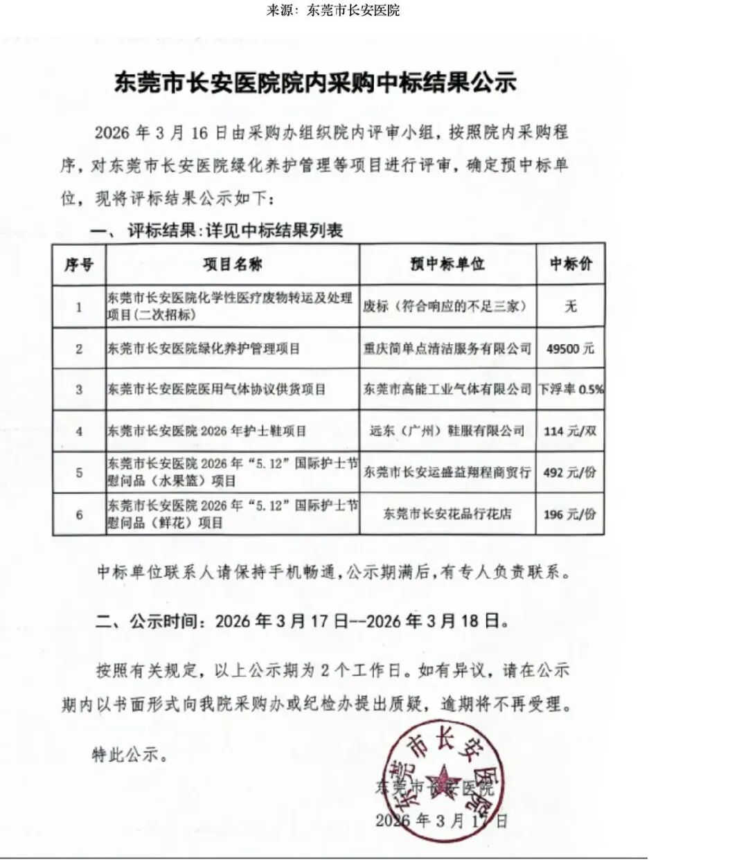 其中,第5项为东莞市长安医院2026年“5.12”国际护士节慰问品(水果篮)项目,中标价格为492元/份,预中标单位为东莞市长安运盛益翔程商贸行,公示时间为3月17日至3月18日。
