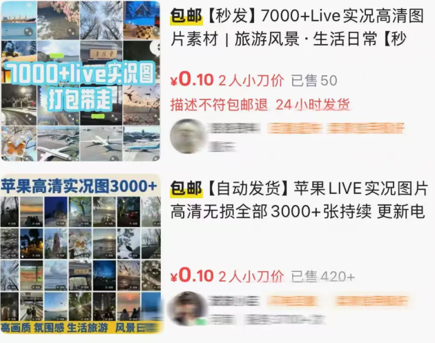 搜索购物软件和二手交易平台可以发现,多家店铺都在售卖名为“朋友圈实况图片”的商品,价格集中在1—8元。商家在商品详情页标注“可用于朋友圈配图、社交媒体起号”等,所售的照片统一通过网盘交付。记者发现,这些网盘链接中包含上千张live实况照片,包括国内外的旅游风景、购物美食等生活日常,以及单人进行高尔夫、滑雪等运动的实况照。