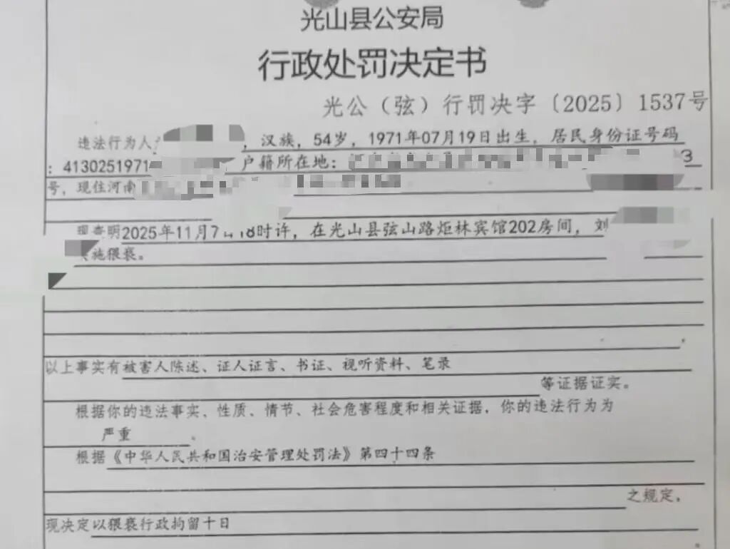 11月19日,光山县公安局以猥亵对刘某处以行政拘留10日的处罚