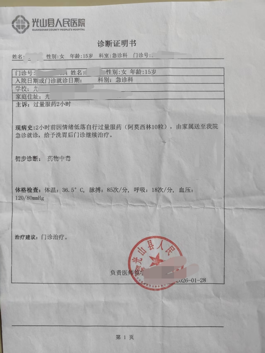 11月19日,光山县公安局以猥亵对刘某光处以行政拘留10日的处罚。王先生对此不服,希望追究涉事班主任刘某光的刑事责任。他称,女儿心理受伤严重,曾于2026年1月28日服用过量阿莫西林,导致药物中毒,被送医洗胃。据王先生提供的一张诊断证明书显示,王小小因情绪低落自行过量服用阿莫西林10粒,被诊断为药物中毒,紧急进行了洗胃。