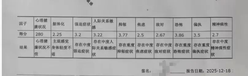 医院2025年12月18日出具的《心理健康临床症状自评量表》显示,王小小存在重度抑郁症状、中度焦虑症状、中度敌对症状、重度恐怖症状、重度偏执症状、中度精神病性症状等。