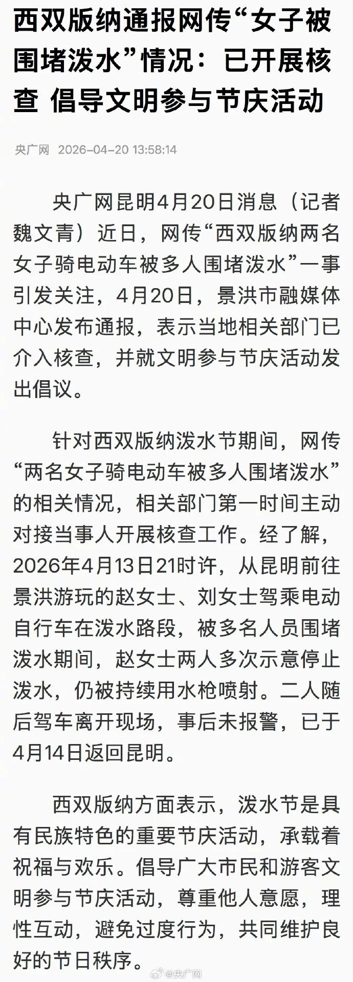 4月20日,@央广网:近日,网传“西双版纳两名女子骑电动车被多人围堵泼水”一事引发关注,4月20日,景洪市融媒体中心发布通报,表示当地相关部门已介入核查,并就文明参与节庆活动发出倡议。