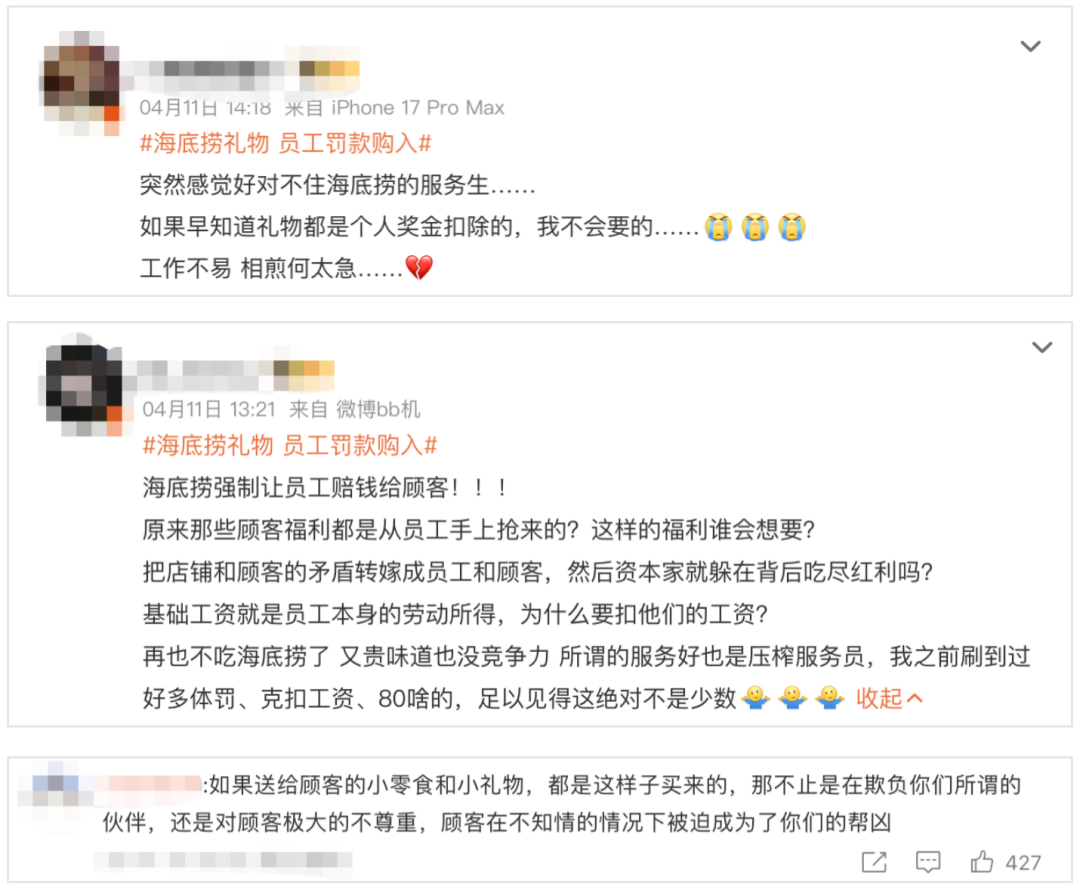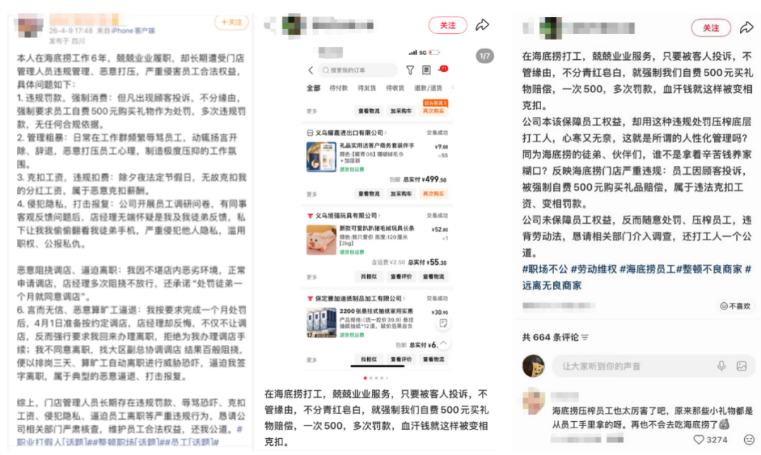 4月9日,有海底捞员工在小红书、微博平台发帖称其所在门店只要出现顾客投诉,便强制要求员工自费购买礼物进行赔偿,并附网购礼物订单截图,其中包括礼品包括珊瑚绒毛巾礼盒、120厘米毛绒玩具等;此外,帖文还提及门店管理粗暴、克扣工资、侵犯员工隐私、恶意阻挠其调离当前门店、以排班算旷工的方式逼迫其主动离职等管理问题。相关情况引发舆论热议。